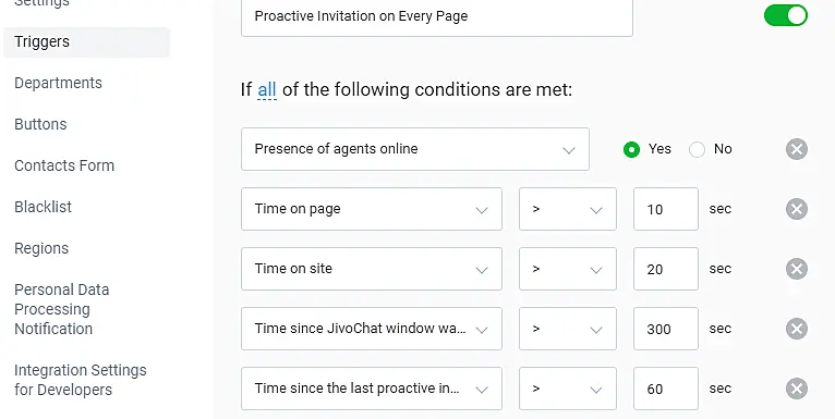 Image: JivoChat provides 15+ triggers to help personalize your proactive chat messages.