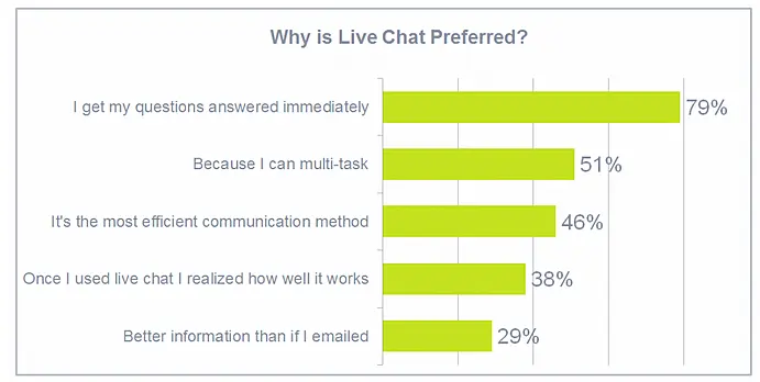 Of those who prefer live chat, 79% said they did so because they get their questions answered quickly, 51% did so because they could multi-task, and 46% agreed it was the most efficient communication method.
