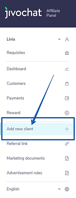 Please note that you can't add an existing customer using this button. If you want to add an client that already has an account on JivoChat, start a chat to talk to the affiliate program manager or send an email directly to paula@jivochat.com.