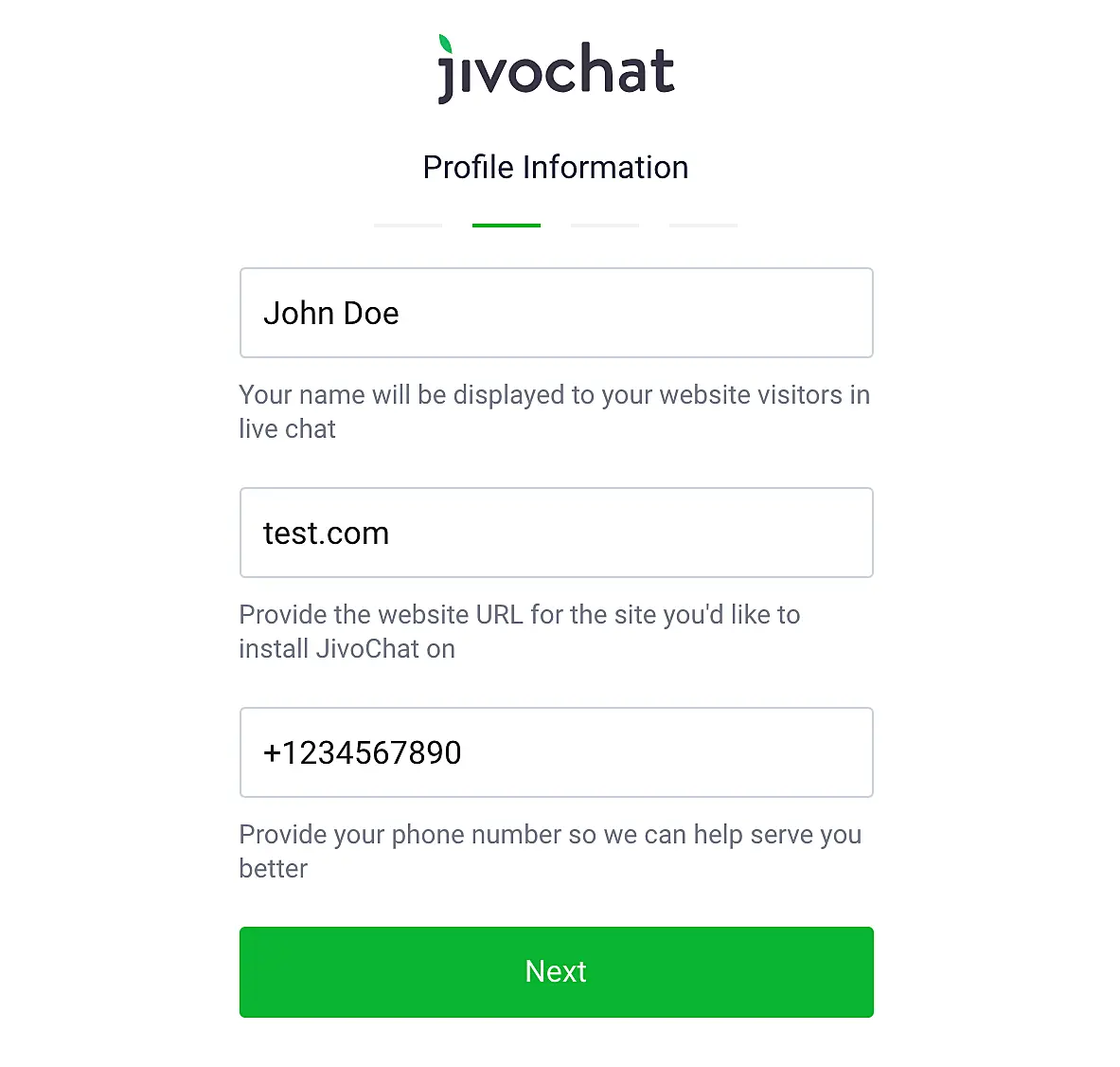 4.2. Enter the name of administrator, website address (where the live chat will be installed), and telephone number (optional).