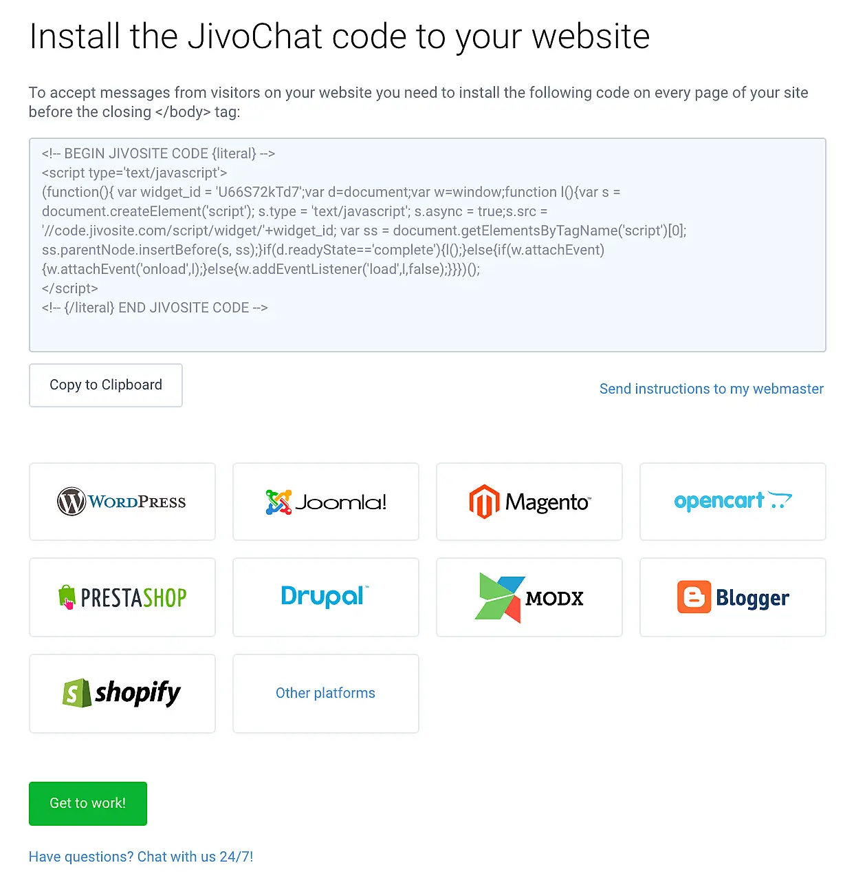 4.4. This is the final stage of the registration process. Here you can copy the chat code to install on your client's website or send it to the administrator of his website by email.