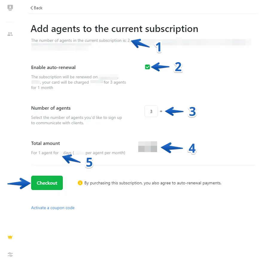 - 4. Total amount of the purchase. Please notice that you'll initially pay only for the remaining days of the current subscription for the extra licenses you want to purchase. The full payment for all licenses will be made in the next renewal date.