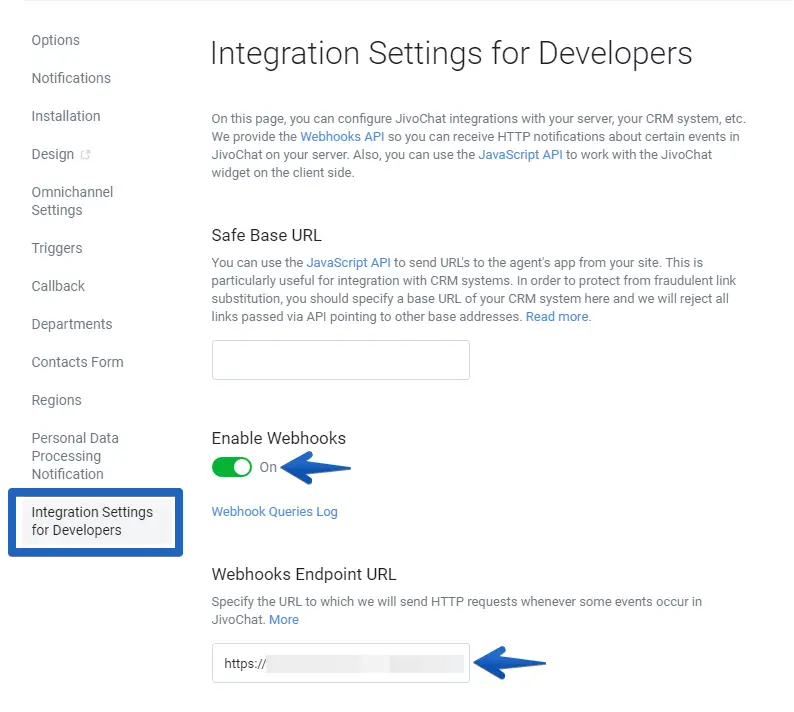 Next, enter the menu "Integration Settings for Developers", activate the option "Enable Webhooks" and insert your Endpoint URL in the "Webhooks Endpoint URL" field.