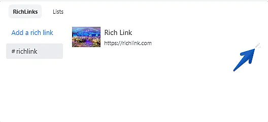 To edit or delete a Rich Link, open the list of existing Rich Links and click the small edit button located at the lower right corner of each Rich Link.