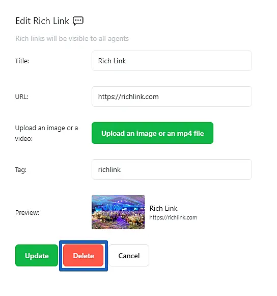 Edit the Rich Link as you desire and press "Update", or click the "Delete" button to delete the Rick Link.