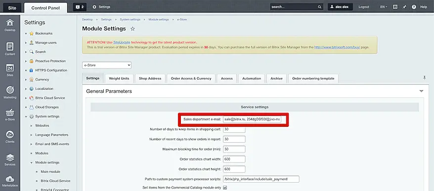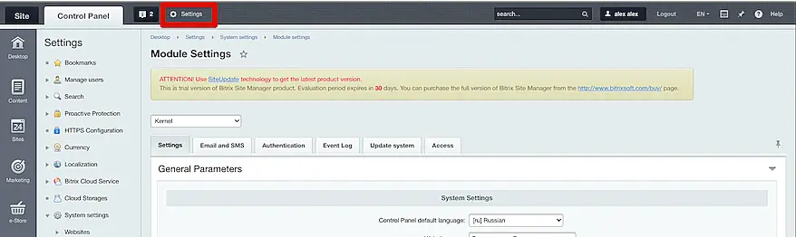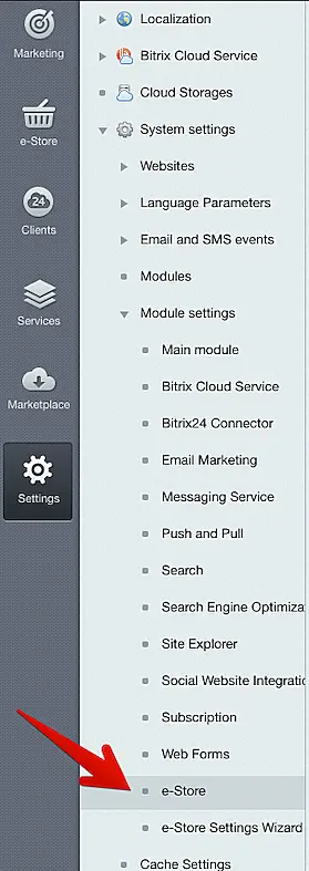 5. In your Bitrix admin panel, go to "Settings" (in the header) -> Product settings -> Modules -> Online store.