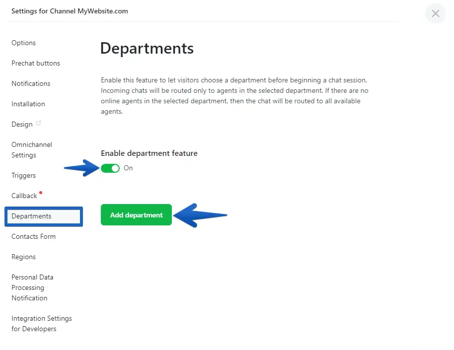 2.Go to the Departments section, click to enable the feature and add new departments.