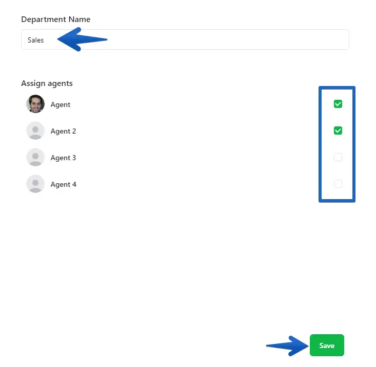 3.Name your new department, assign the proper agents to the department you're creating and press 'Save' to create the department.