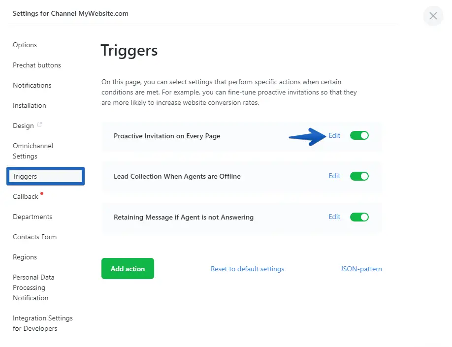 For setting Proactive invitations to be sent from a specific department, go to the 'Triggers' section and select 'Proactive Invitation on Every Page' (default trigger; you can do this same procedure on any new/existing trigger you have) -> 'Edit'.