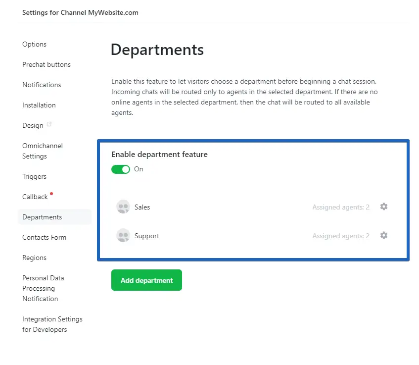 The Departments feature is used on large and medium-sized company websites. This allows you to divide agents into different groups, so customers be able to select a suitable department before beginning a chat session. It’s a useful feature that saves staff time when there are more specific customer requests.