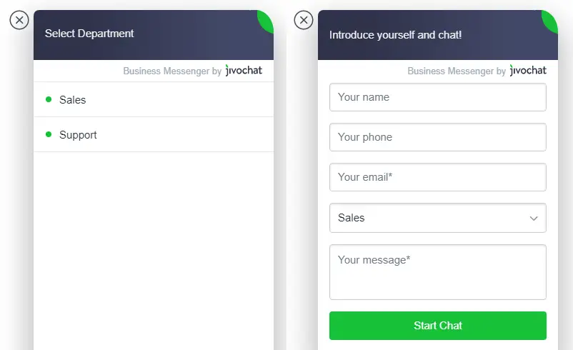 If you select to require visitors’ contacts 'Before chat' (at the 'Contacts Form' section) then the chat will be displayed as shown in the image below on the left. If you set the contact form value to 'During chat' or 'Disable', then the departments will be shown like in the image on the right.