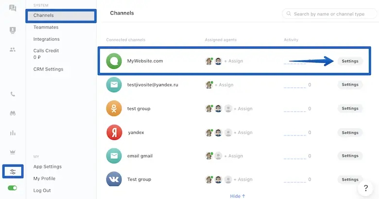 1.Open your JivoChat web app or any of our Desktop apps and go to Manage -> Channels -> Settings (next to your website channel).