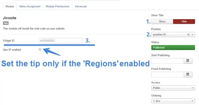 Select JivoChat’s position on your website using Module Assignment: On all pages. We recommend the footer position.