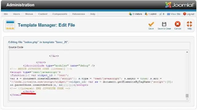 Now you should edit the main code of your site. Paste the JivoChat code before the </body>