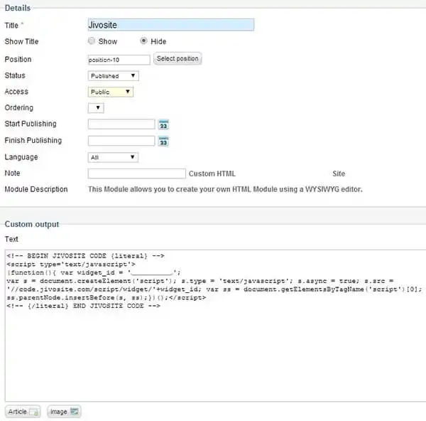 To install JivoChat on your Joomla site, you can use our module, which is available from links at the bottom (for different versions), in the Installation section.