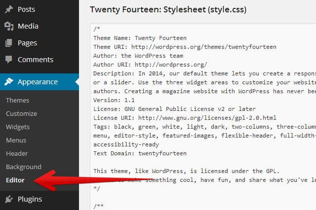 Go to your WordPress admin panel, and navigate to the Appearance section. «Appearance» -> «Editor».