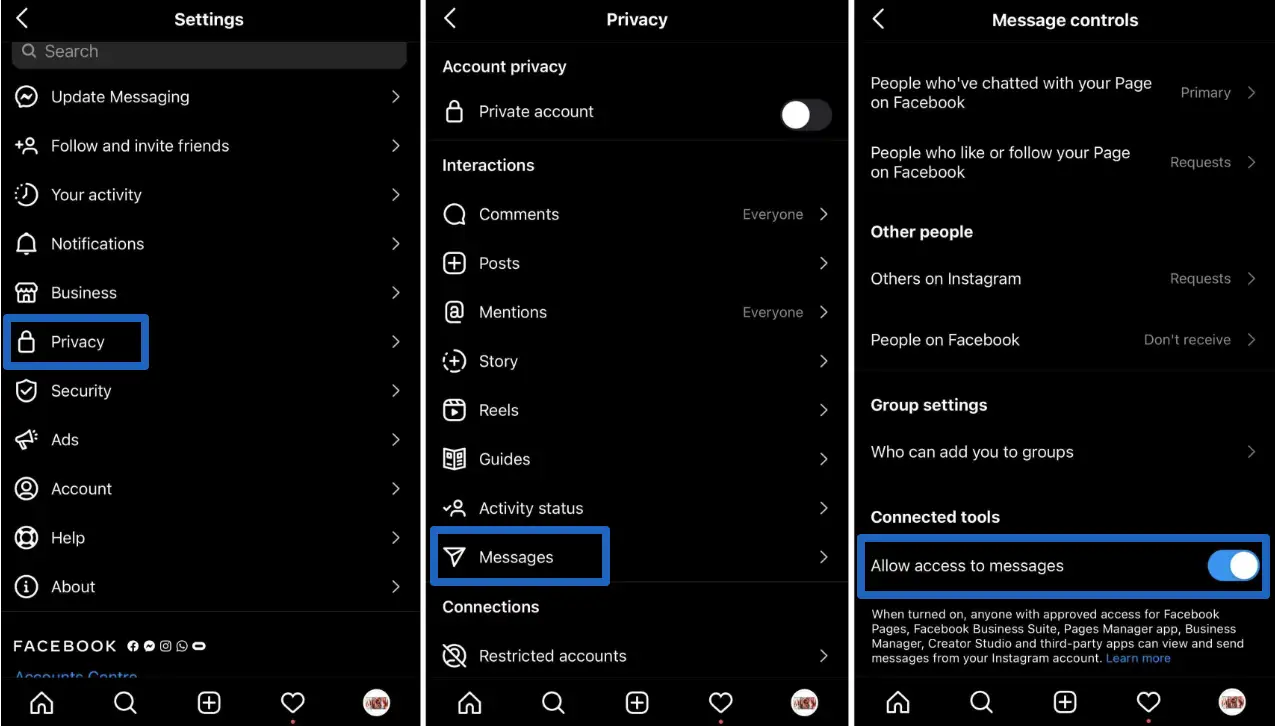 First, enable the option "Allow access to messages" is activated in your Instagram app ("Settings" > "Privacy" > "Messages").