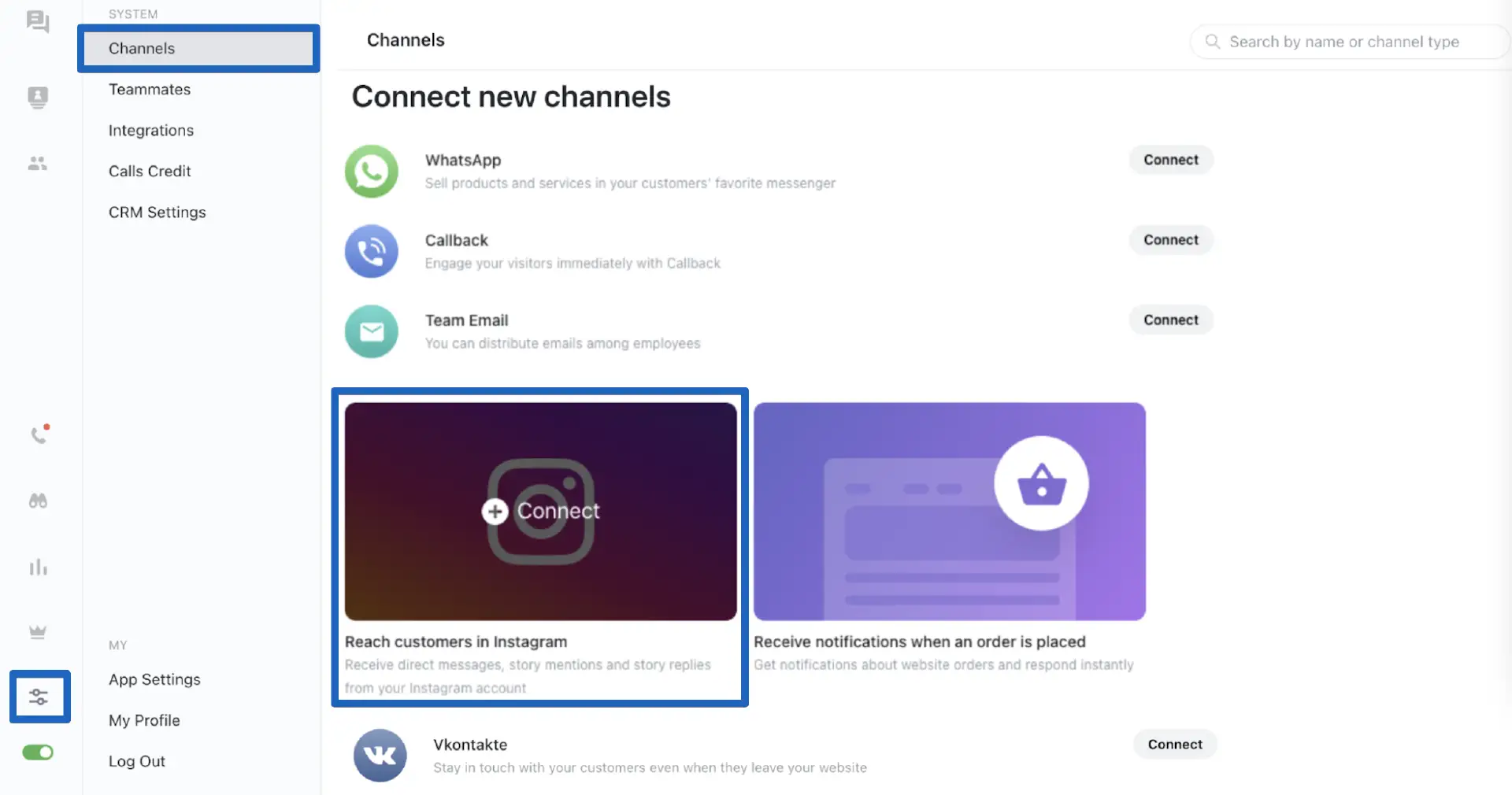 After that, open JivoChat app and go to "Manage" > "Channels":