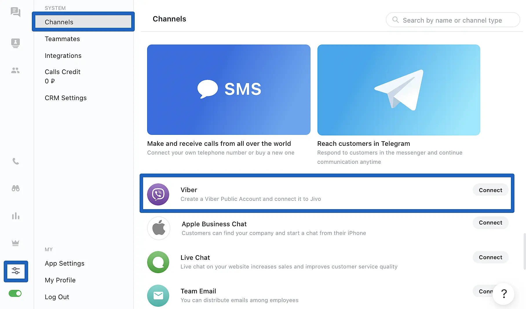 Now open JivoChat app and go to "Manage" -> "Channels", find "Viber" in the list of suggested channels and click "Connect".