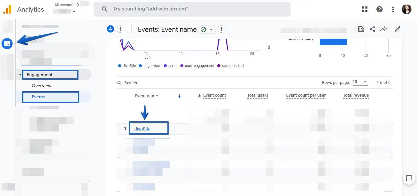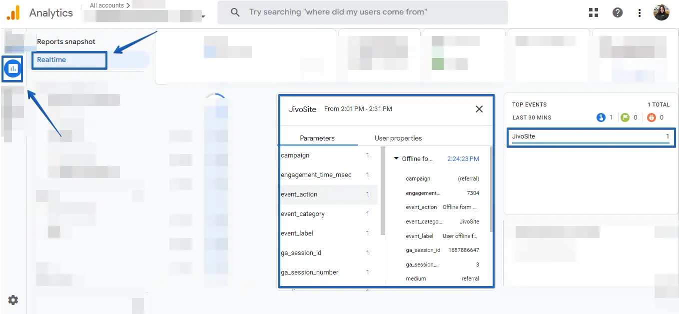 *Important: If it hasn't appeared yet, check the "Realtime" option. Search for "JivoSite" and you will see the event in the same way inside the session.*