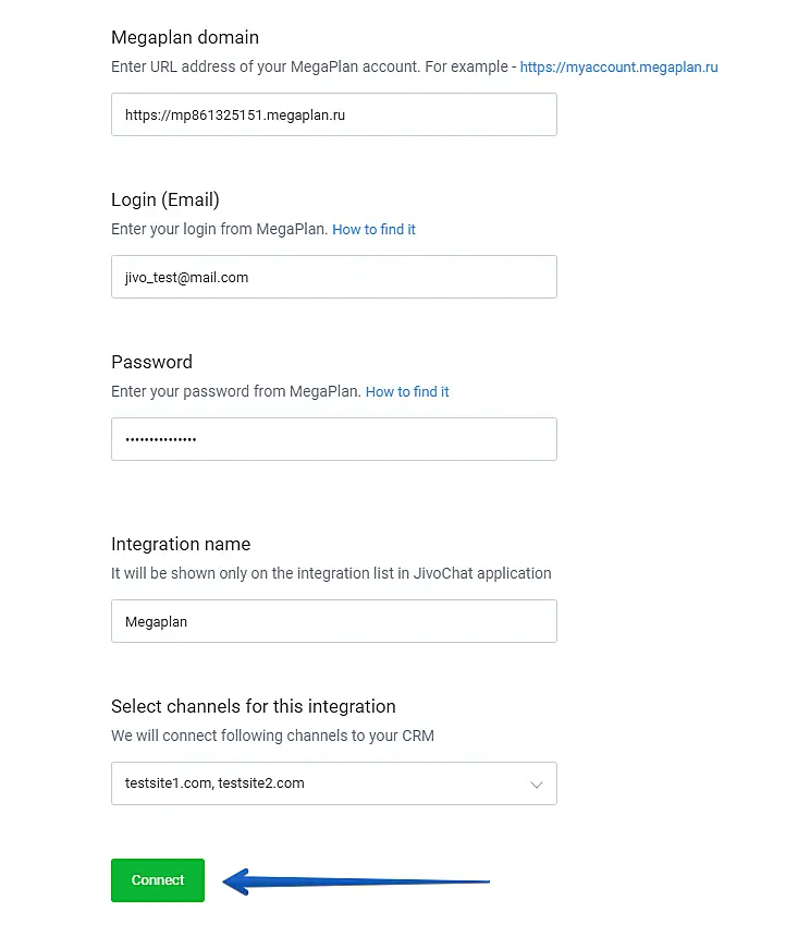 To integrate Megaplan, open your JivoChat application and go to Manage > Integrations and click on Megaplan.