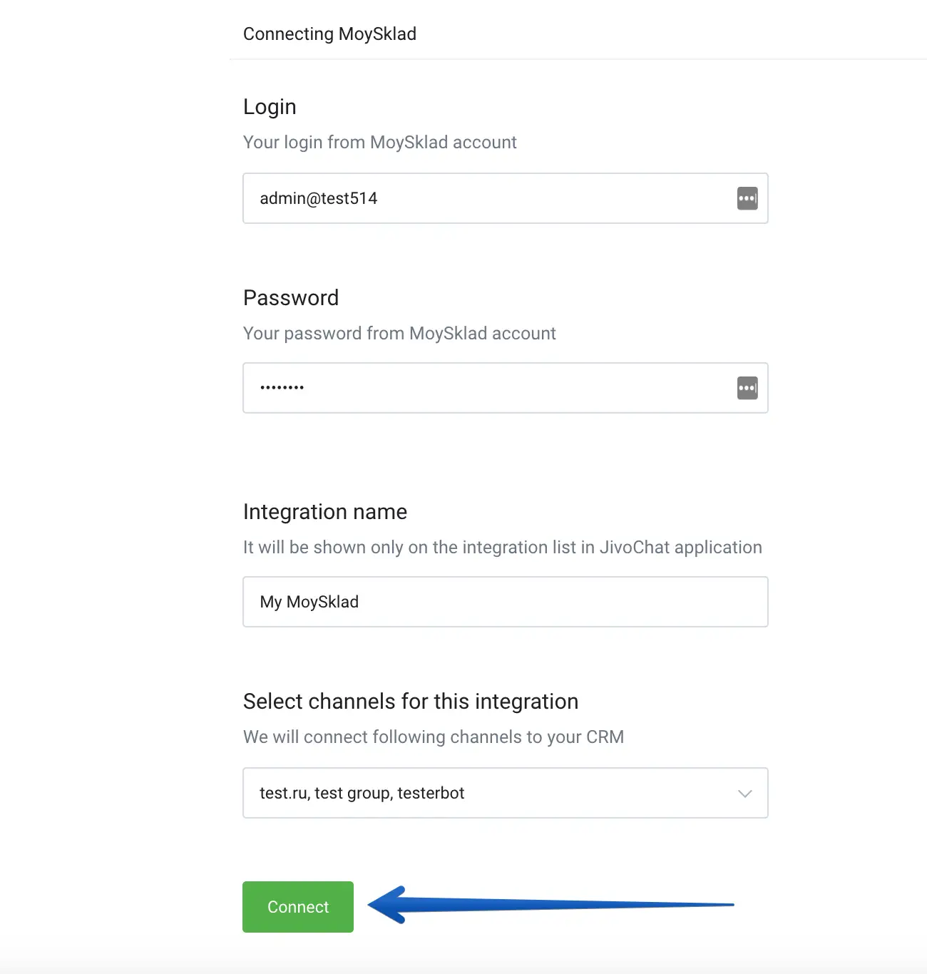 Congratulations! JivoChat data will be automatically transferred to your CRM system from now on. After connecting, the integration will appear in the "Connected integrations" list, where you can change its settings and view the event logs.