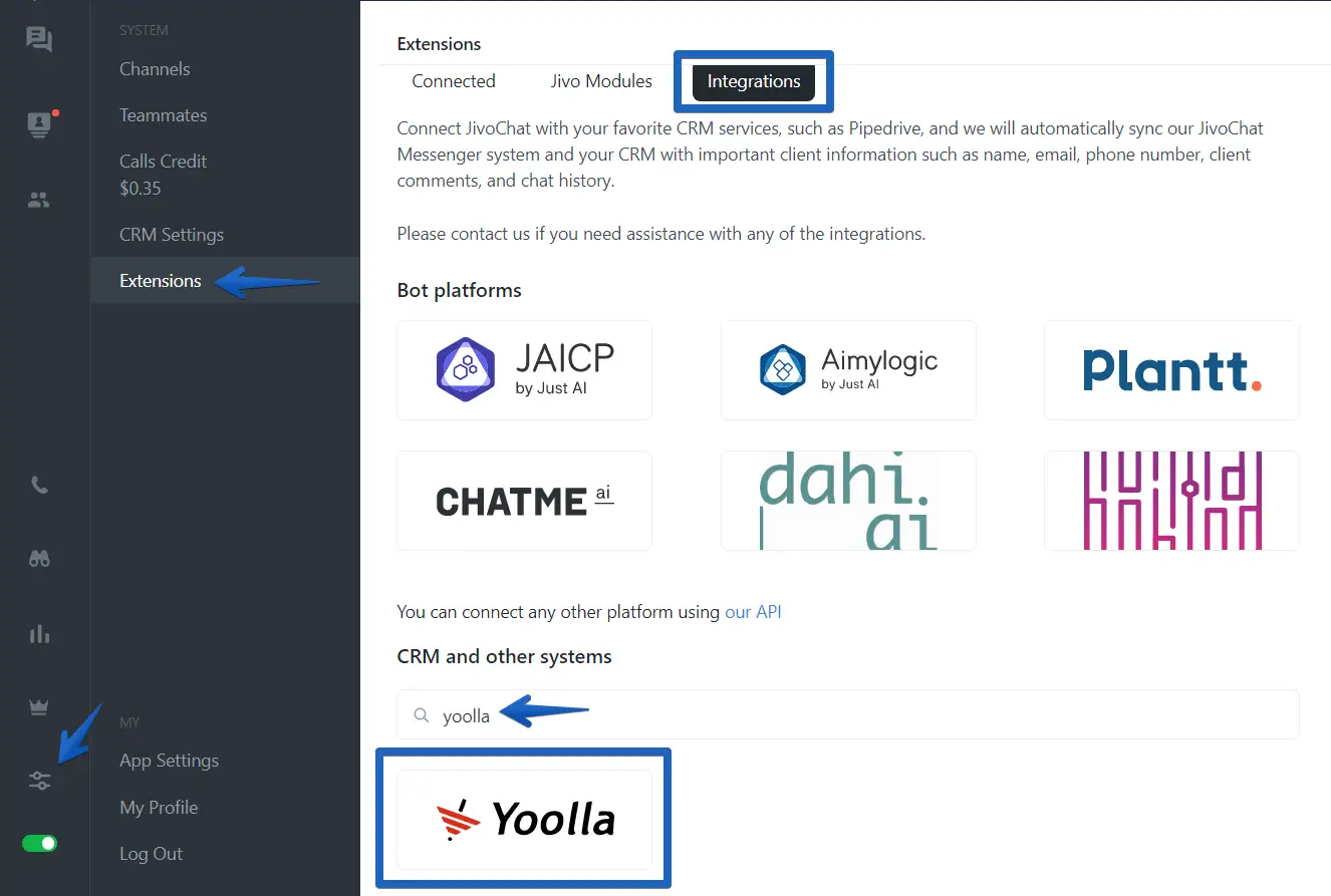 To integrate Yoolla, open your JivoChat application and go to Manage > Extensions> Integrations and search Yoolla.