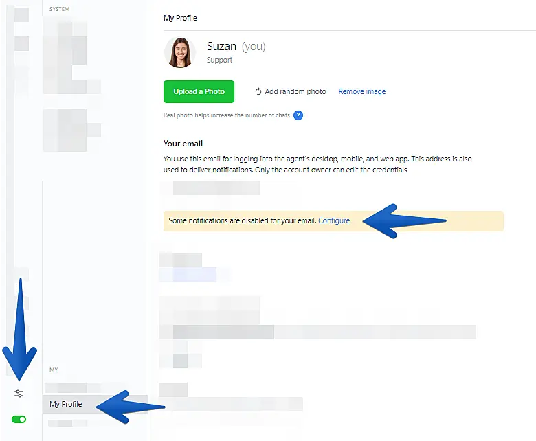 First, login to your JivoChat Desktop app or Web app and go to "Manage" > "My Profile" -> In "Your E-mail", click on "Configure"
