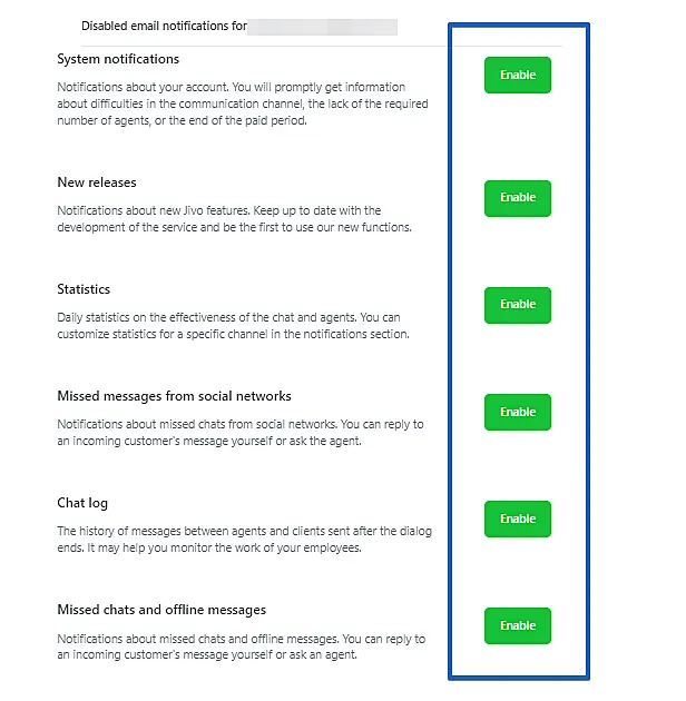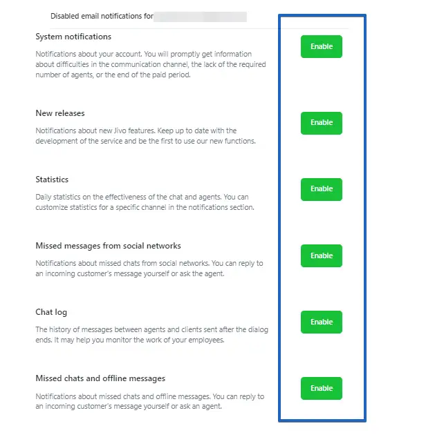 Then click on the "Enable" button in all options, so that your email will be removed from the unsubscribe (unsubscribe list) and you may be receiving notification emails from JivoChat again
