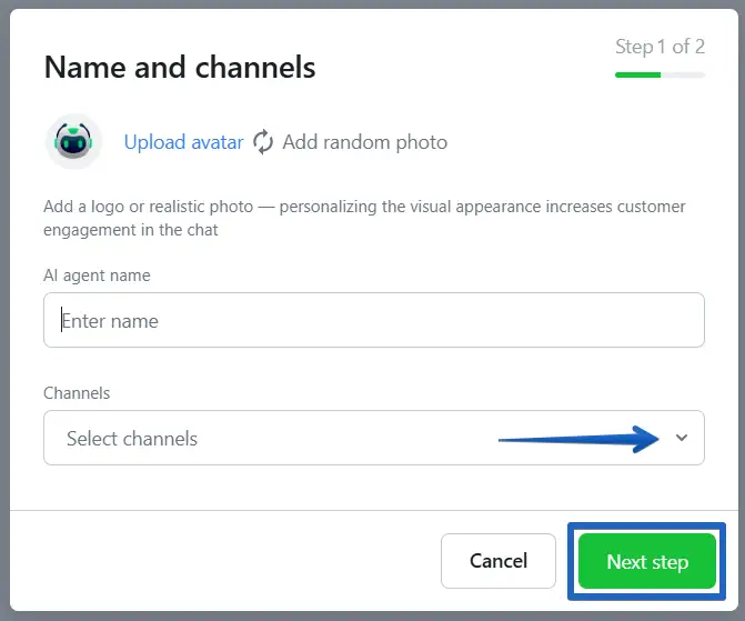 In the opened settings, upload the agent avatar and specify its name. These details will be displayed in the chat to your site visitors.