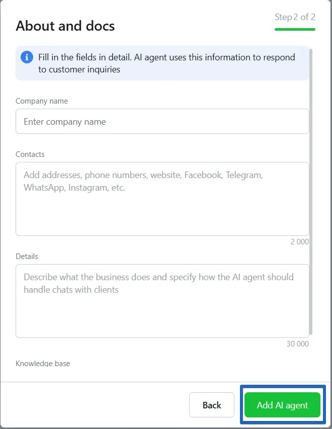 On the next step, provide all the necessary details the AI Agent should use when generating replies. Fill in the fields as thoroughly as possible — this will help make responses more accurate.