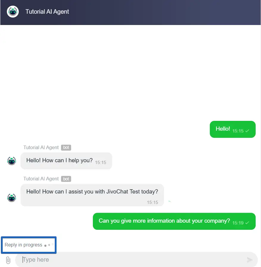 Once configured, the AI Agent can respond to customers according to the defined rules. While generating a reply, the chat will display "Reply in progress".