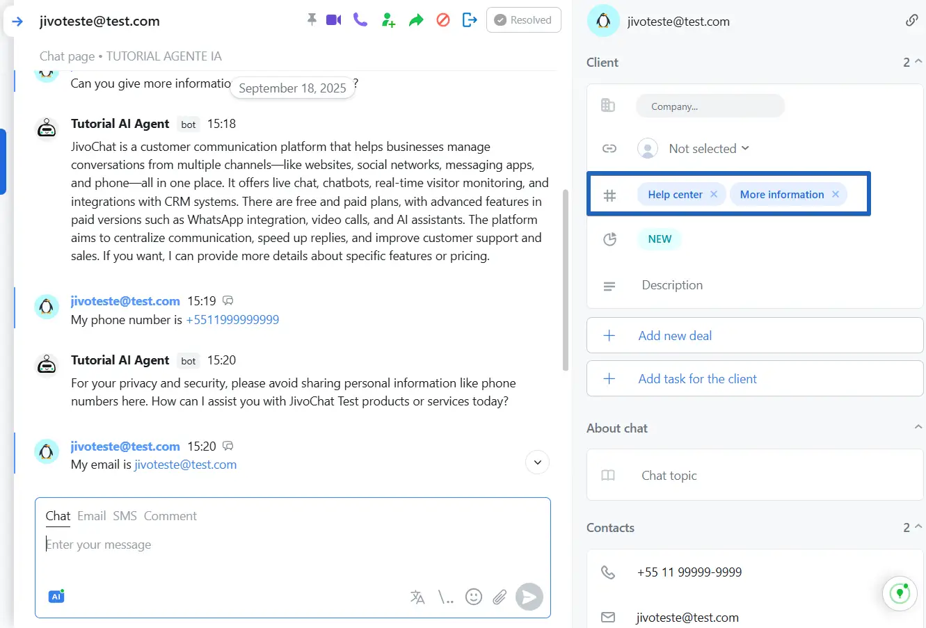 Jivo has introduced a new feature — the AI Agent, which helps automate customer communication and handle complex tasks without human intervention. It will capture contacts left by the visitor in the chat, tag conversations, and also analyze customer sentiment.
