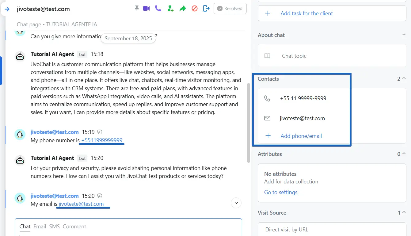 When to request customer contacts. The AI Agent can ask for phone and email and automatically record them in the chat’s info panel.
