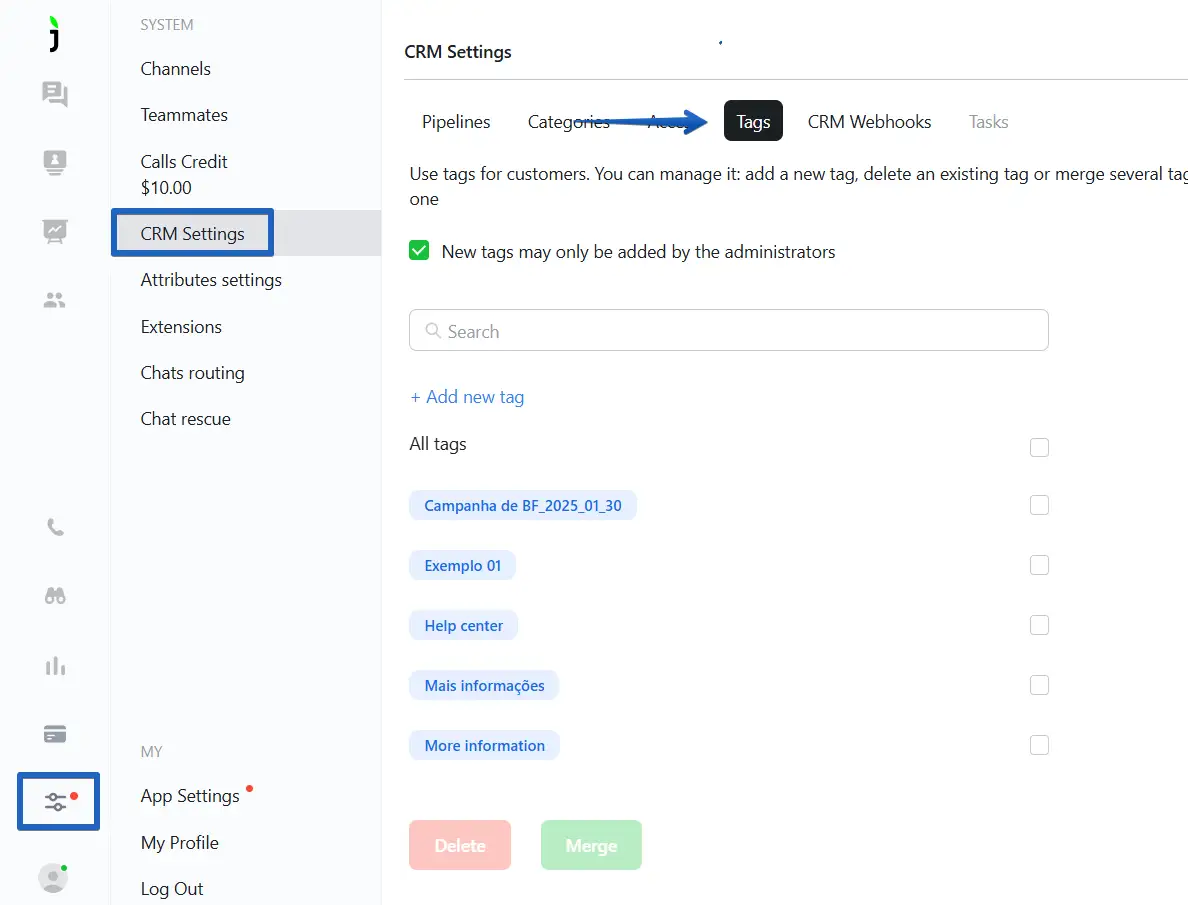 Tags are listed in Settings > CRM Settings > Tags, where they can be renamed or deleted.
