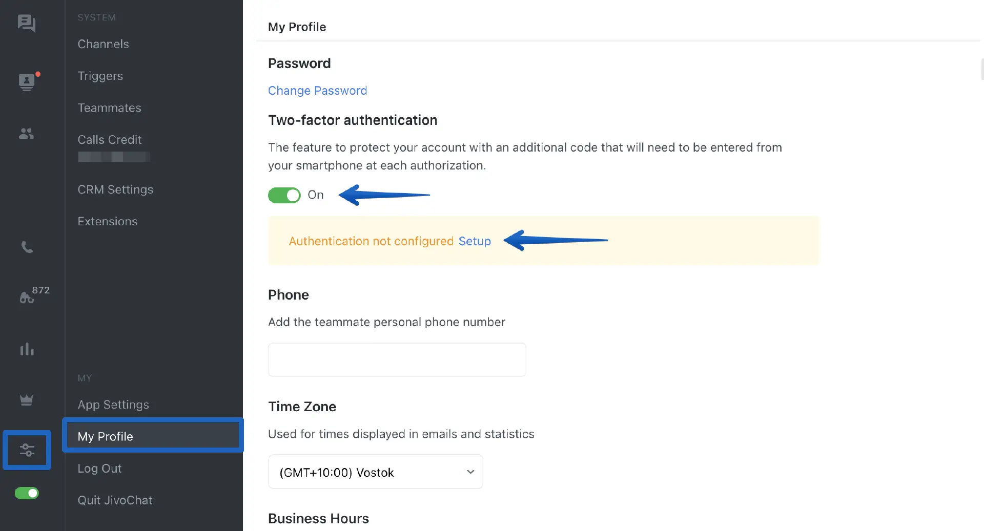 First, open JivoChat app, navigate to "Manage" > "My profile" and enable 2FA option there.