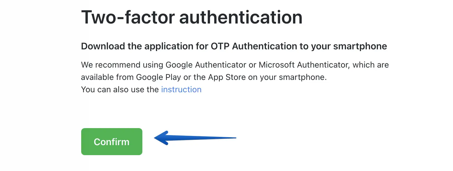 On the next step you will need to install a desired OTP Authenticator app. These two are the most popular ones: Google Authenticator and Microsoft Authenticator. Here're the links to download the apps from AppStore and GooglePlay: