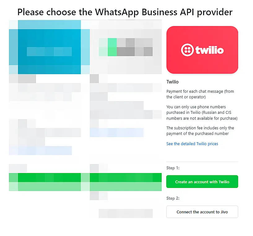 Create your Twilio account and connect it to JivoChat to receive and answer messages sent by your visitors on WhatsApp directly from JivoChat. This integration also allows you to add a WhatsApp communication option in the JivoChat mobile widget so that your visitors can choose to start a conversation with you directly from WhatsApp.