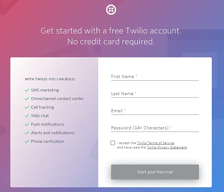 To create your Twilio account, please enter Twilio's website and fill in your data. Note: no credit card is necessary for the registration: