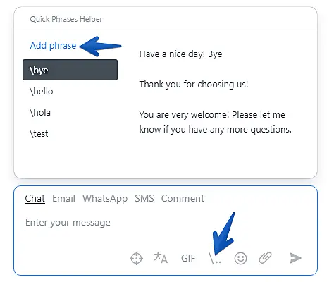 After opening the Quick Phrases window by typing / or \ on your keyboard or by directly clicking the \.. icon, find and click to select which template phrase you want to send in chat. You can also use your keyboard arrows to move through the existing phrases for a faster selection.