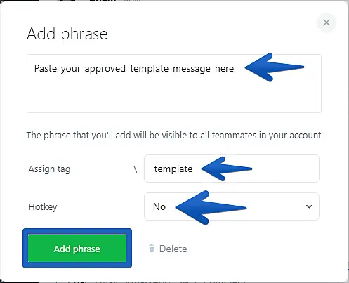 Paste your approved Template Message, exactly as it is on your Twilio panel, choose a tag / to assign it to which can be used later on to quickly find and select a desired Template Message to send in chat, select a quick shortcut (Optional) on your keyboard and click to Add phrase.