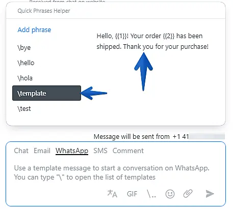 After clicking on a phrase or using your keyboard arrows to select it, they'll show the placeholder variables that you created during your Template Message approval on Twilio. Replace the placeholders with the desired information and send it to your client.